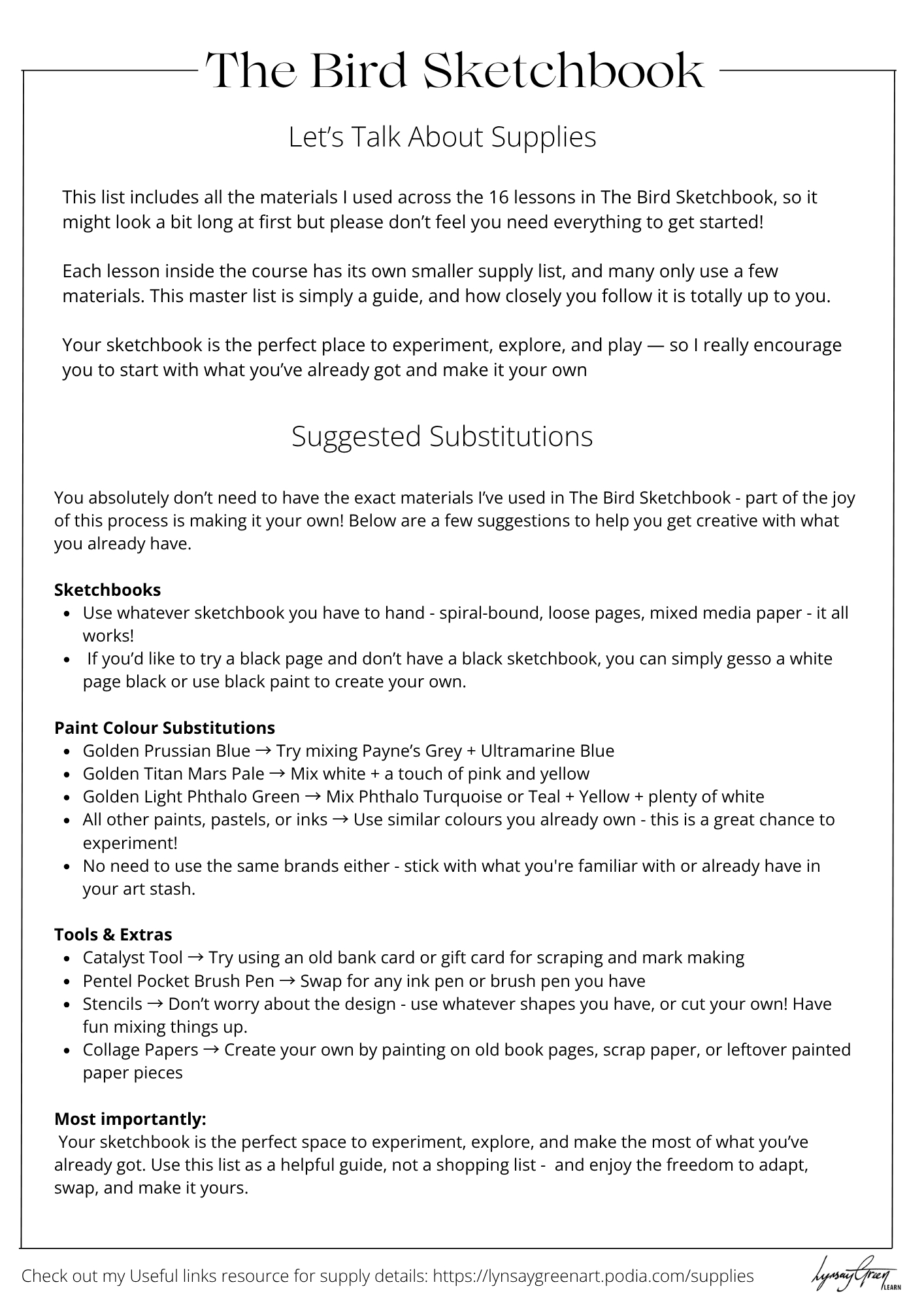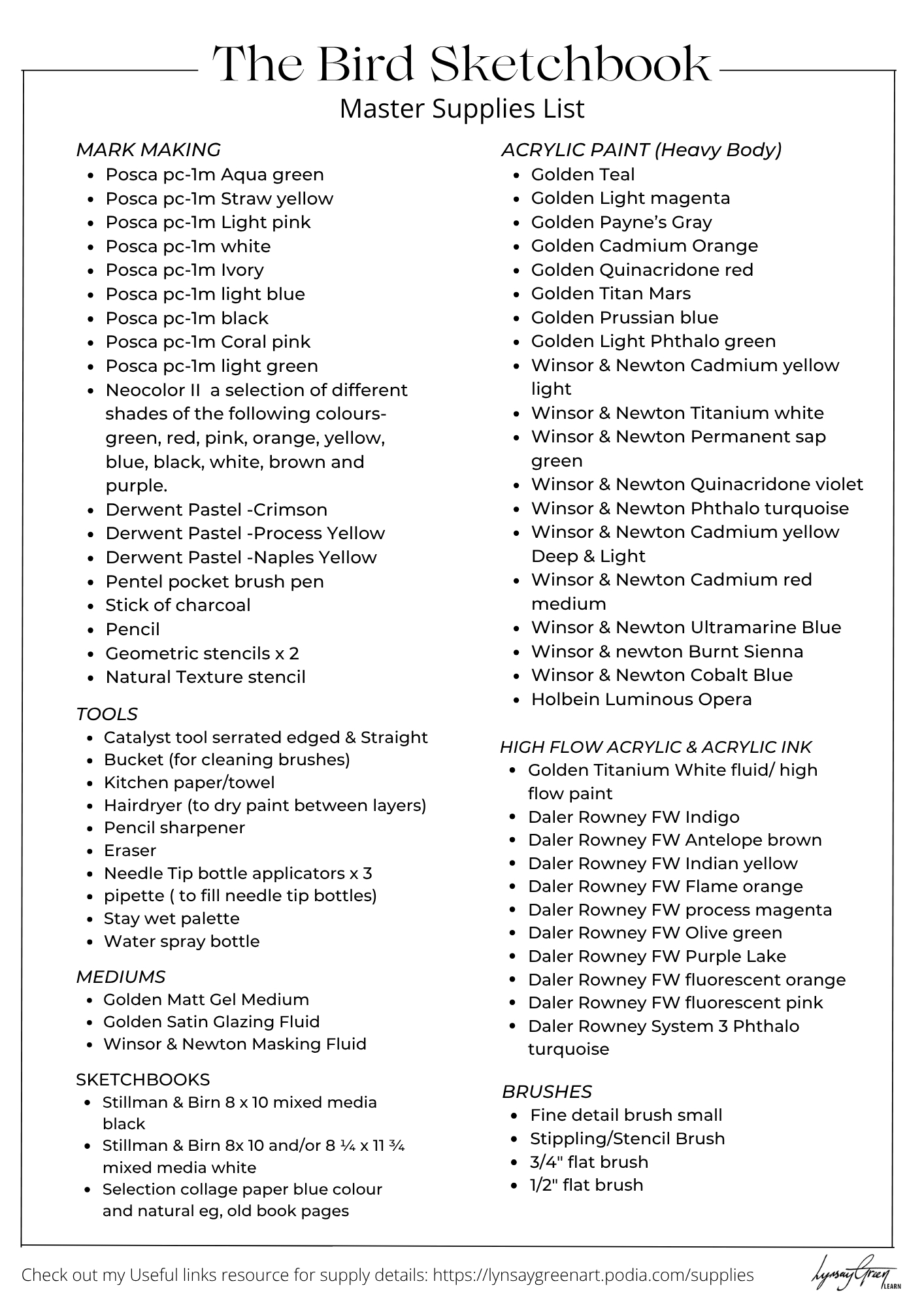 A full list of all the materials I use in the course across all 16 lessons - but please don’t feel you need everything! I really encourage you to use what you already have and swap in similar colours or supplies. This course is all about exploration, not perfection, and there’s plenty of room to make it your own.